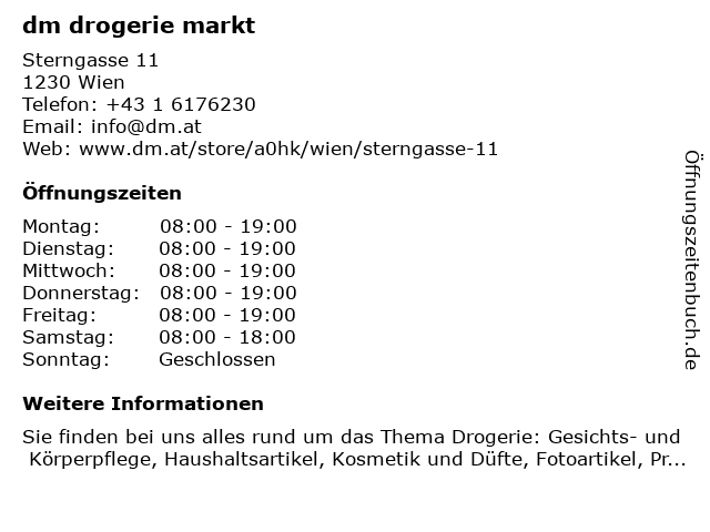 | Öffnungszeiten dm drogerie markt in Wien anzeigen | |
