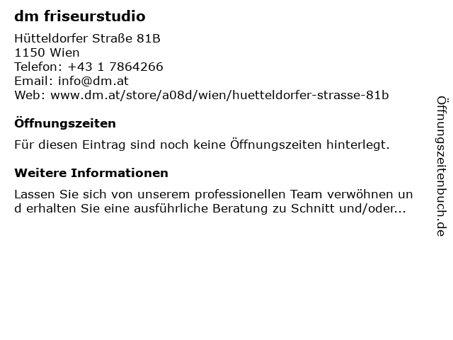 | Öffnungszeiten dm friseurstudio in Wien anzeigen | |
