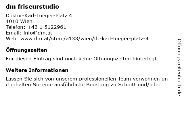 | Öffnungszeiten dm friseurstudio in Wien anzeigen | |