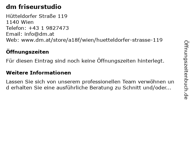 | Öffnungszeiten dm friseurstudio in Wien anzeigen | |