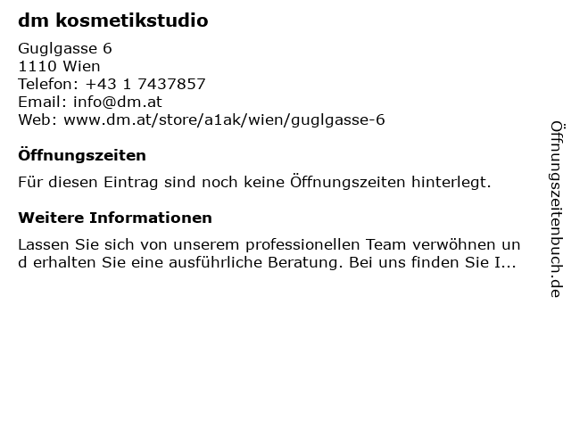 | Öffnungszeiten dm kosmetikstudio in Wien anzeigen | |