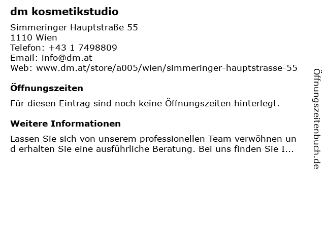 | Öffnungszeiten dm kosmetikstudio in Wien anzeigen | |