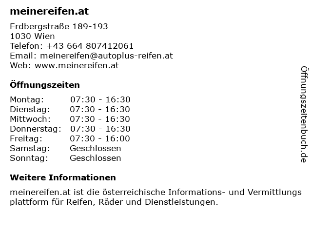 | Öffnungszeiten meinereifen.at in Wien anzeigen | |