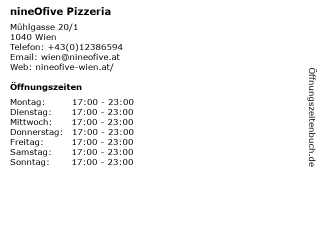 | Öffnungszeiten nineOfive Pizzeria in Wien anzeigen | |