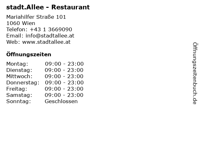 | Öffnungszeiten stadt.Allee - Restaurant in Wien anzeigen | |