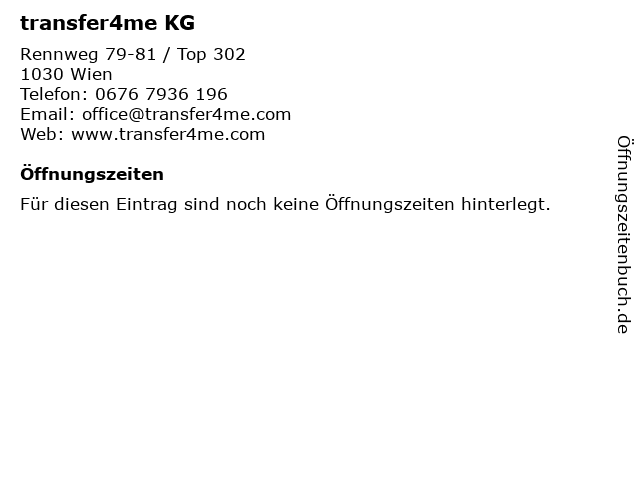 Öffnungszeiten transfer4me KG in Wien anzeigen | |