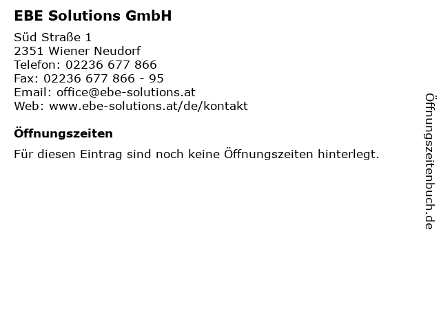 | Öffnungszeiten EBE Solutions GmbH in Wiener Neudorf anzeigen | |