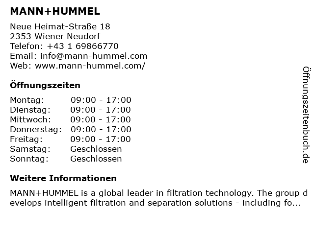 | Öffnungszeiten MANN+HUMMEL in Wiener Neudorf anzeigen | |