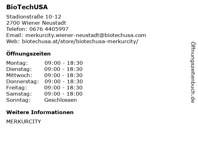 | Öffnungszeiten BioTechUSA in Wiener Neustadt anzeigen | |