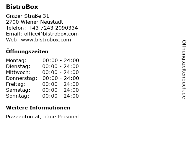 | Öffnungszeiten BistroBox in Wiener Neustadt anzeigen | |