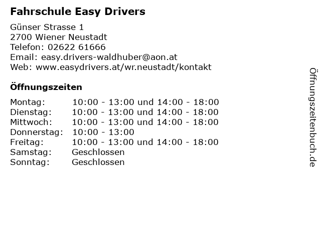 5 Fahrschule Easy Drivers - Aussenlokal von Berndorf (Entfernung: 17,39 km) Wiener Neustädter Straße 18, 2540 Bad Vöslau 6 Fahrschule EASY DRIVERS Bad Vöslau (Entfernung: 17,41 km) Wiener Neustädter Straße 22, 2540 Bad Vöslau |