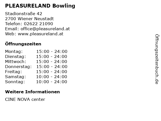 | Öffnungszeiten PLEASURELAND Bowling in Wiener Neustadt anzeigen | |