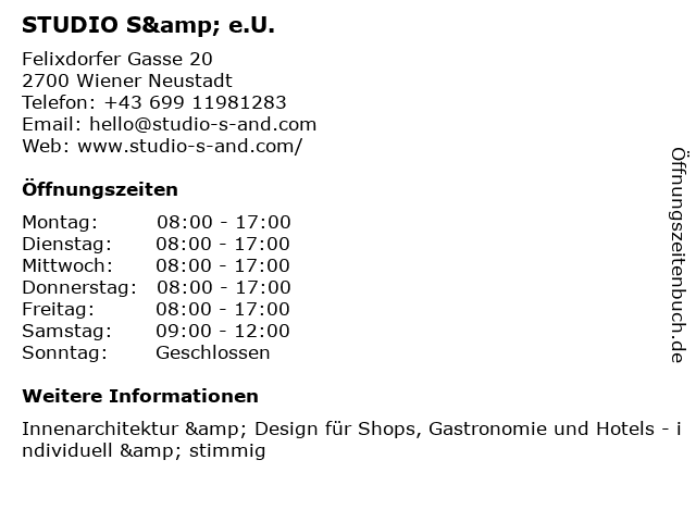 | Öffnungszeiten STUDIO S& e.U. in Wiener Neustadt anzeigen | |