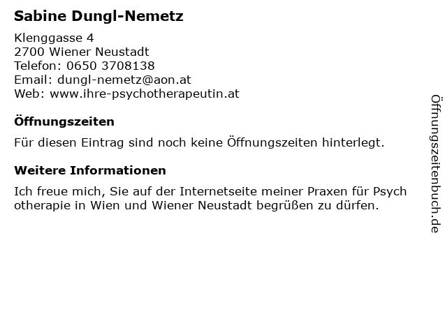 | Öffnungszeiten Sabine Dungl-Nemetz in Wiener Neustadt anzeigen | |