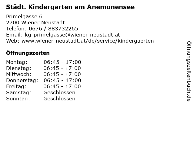 1 Städt. Kindergarten Fischabachsiedlung (Entfernung: 0,81 km) Nikolaus Pacassi-Gasse 1, 2700 Wiener Neustadt 2 Städt. Kindergarten Schrattensteingasse (Entfernung: 0,89 km) Schrattensteingasse 28, 2700 Wiener Neustadt 6 |