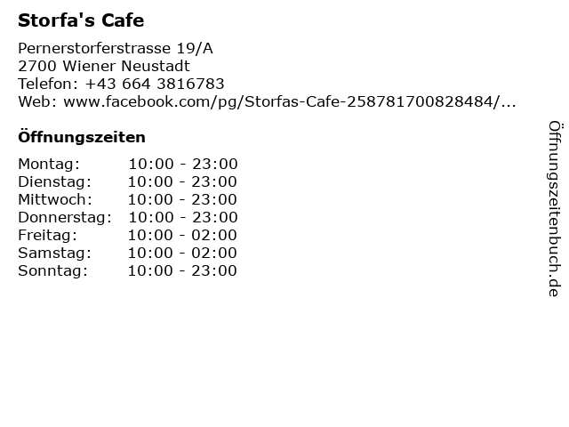 | Öffnungszeiten Storfa's Cafe in Wiener Neustadt anzeigen | |