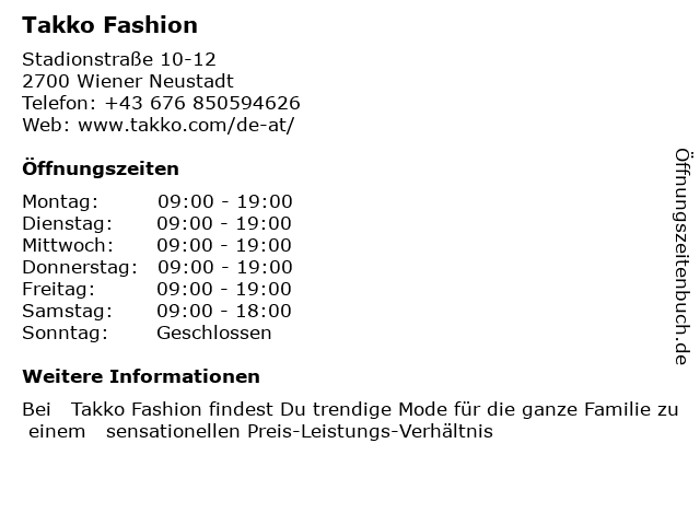 | Öffnungszeiten Takko Fashion in Wiener Neustadt anzeigen | |