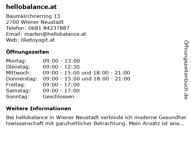 | Öffnungszeiten hellobalance.at in Wiener Neustadt anzeigen | |