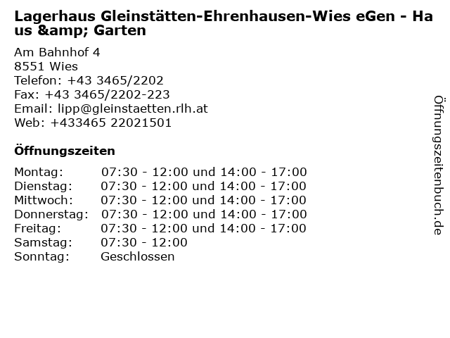1 Lagerhaus Gleinstätten-Ehrenhausen-Wies eGen - Werkstätte Landmaschinen und Ersatzteile (Entfernung: 0,00 km) Am Bahnhof 4, 8551 Wies 2 Lagerhaus Gleinstätten-Ehrenhausen-Wies eGen - Getränkemarkt (Entfernung: 0,04 km) Am Bahnhof 4, 8551 Wies 4 Lagerhaus Gleinstätten - Ehrenhausen - Wies - Genol Tankstelle (Entfernung: 3,17 km) Eibiswald 264, 8552 Eibiswald 5 Raiffeisenbank Gleinstätten-Leutschach eGen - (Bankomat Bankstelle) (Entfernung: 7,05 km) Oberhaag 32, 8455 Oberhaag 6 Raiffeisenbank Gleinstätten-Leutschach eGen - (Bankomat Bankstelle) (Entfernung: 10,74 km) St. Johann im Saggautal 90, 8453 St. Johann im Saggautal |