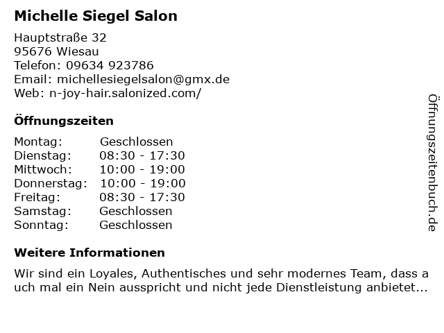 | Öffnungszeiten Michelle Siegel Salon in Wiesau anzeigen | |