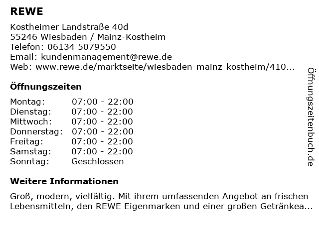 | Öffnungszeiten REWE in Wiesbaden / Mainz-Kostheim anzeigen | |