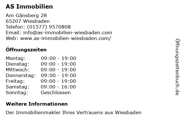 | Öffnungszeiten AS Immobilien in Wiesbaden anzeigen | |