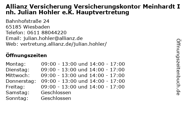 1 Gothaer Versicherungen - Versicherungskontor Klaus Meinhardt (Entfernung: 0,01 km) Bahnhofstr. 24, 65185 Wiesbaden 2 Allianz Versicherung Bastian Diel Hauptvertretung (Entfernung: 0,05 km) Bahnhofstraße 18, 65185 Wiesbaden 4 AXA Versicherung - Hauptvertretung Monika Schaffer (Entfernung: 0,79 km) Eleonorenstraße 8, 65185 Wiesbaden 6 |