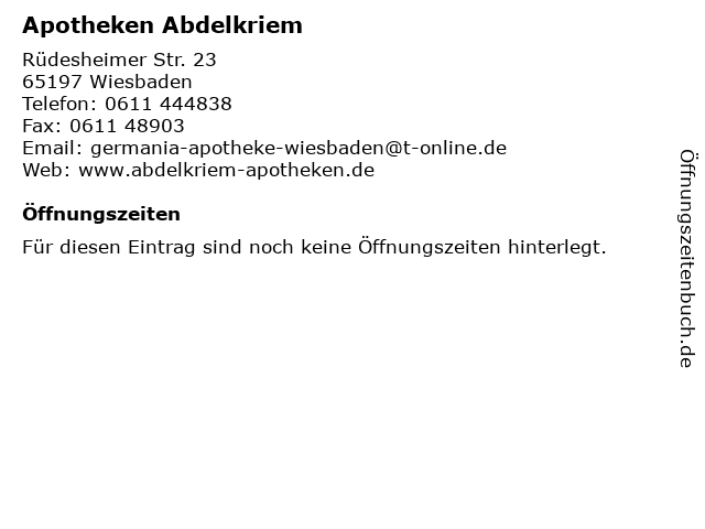 | Öffnungszeiten Apotheken Abdelkriem in Wiesbaden anzeigen | |
