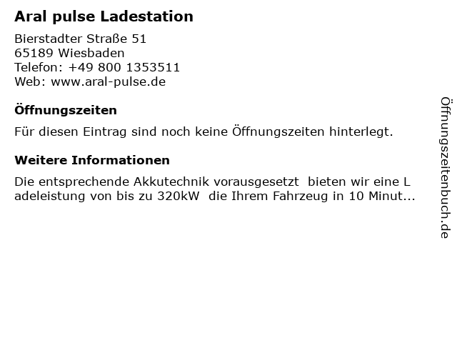 | Öffnungszeiten Aral pulse Ladestation in Wiesbaden anzeigen | |