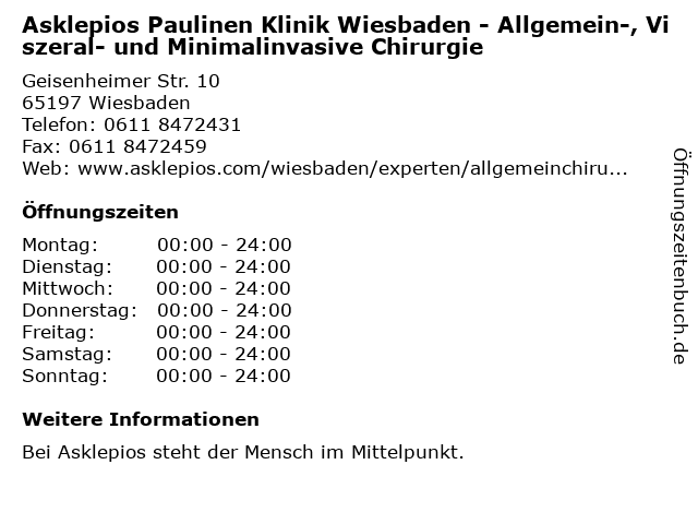 Branchen & Suchbegriffe zu Asklepios Paulinen Klinik Wiesbaden - Allgemein-, Viszeral- und Minimalinvasive Chirurgie:allgemein, asklepios, chirurgie, klinik, minimalinvasive, paulinen, viszeral |