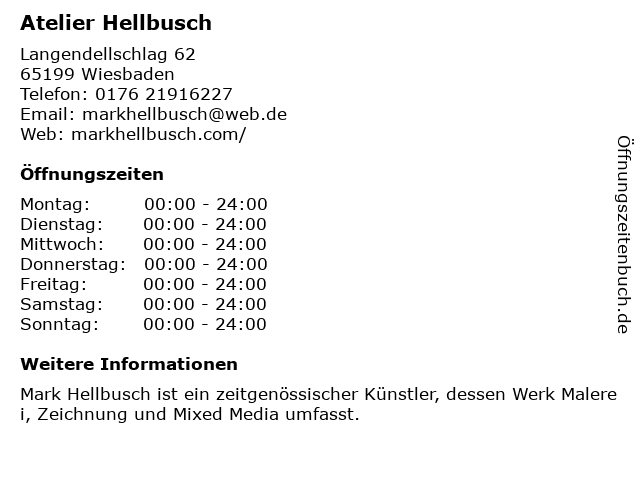 | Öffnungszeiten Atelier Hellbusch in Wiesbaden anzeigen | |
