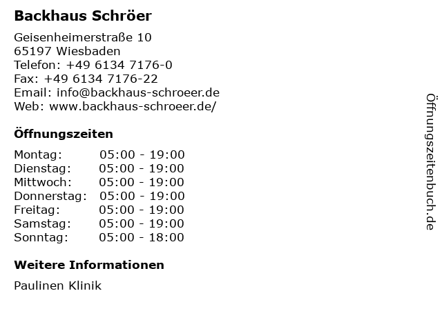 | Öffnungszeiten Backhaus Schröer in Wiesbaden anzeigen | |