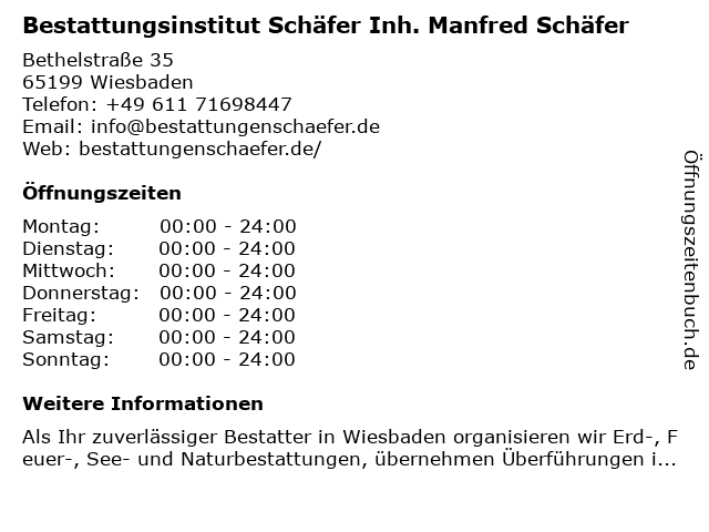 1 Bestattungsinstitut Schäfer Inh. Manfred Schäfer (Entfernung: 0,01 km) Bethelstr. 35, 65199 Wiesbaden 6 |
