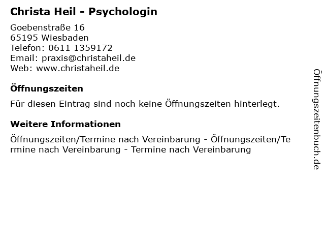 | Öffnungszeiten Christa Heil - Psychologin in Wiesbaden anzeigen | |