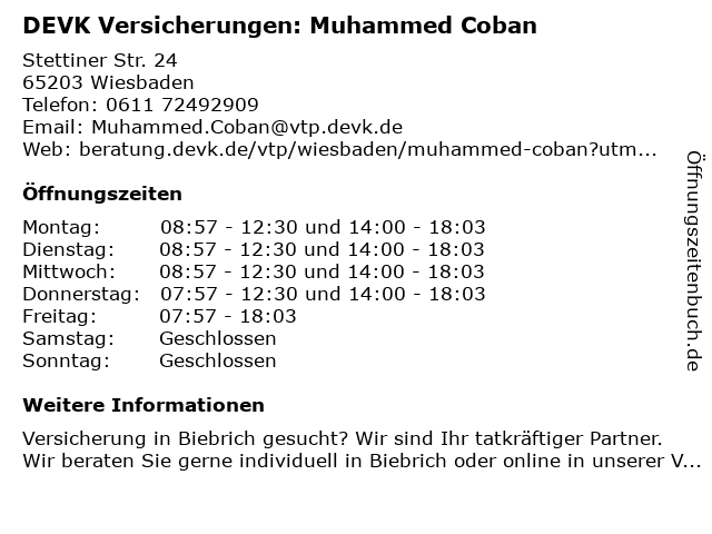 | Montag | 08:57-12:30 und 14:00-18:03 |