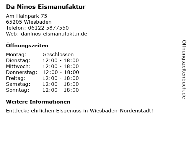 | Öffnungszeiten Da Ninos Eismanufaktur in Wiesbaden anzeigen | |