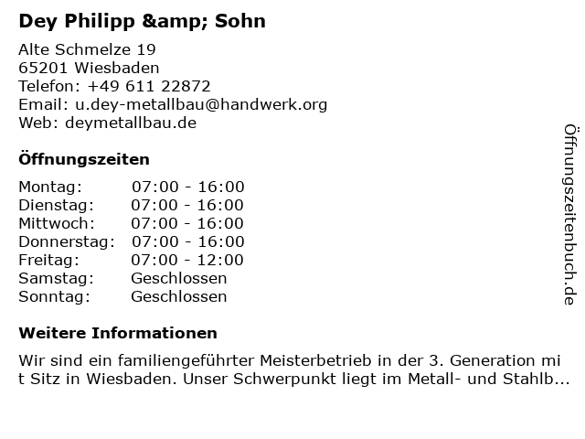 | Öffnungszeiten Dey Philipp & Sohn in Wiesbaden anzeigen | |