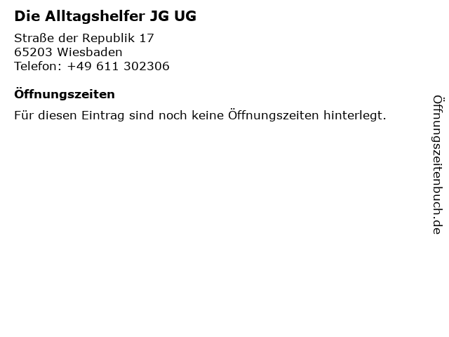 | Öffnungszeiten Die Alltagshelfer JG UG in Wiesbaden anzeigen | |