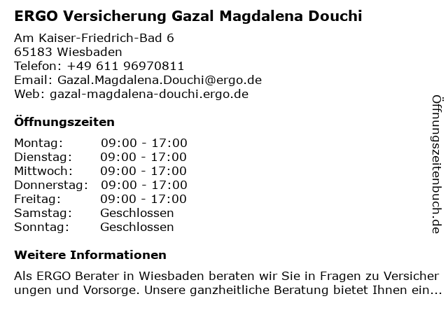 3 ERGO Versicherung Engelhardt, Schmidt & Partner (Entfernung: 0,00 km) Am Kaiser-Friedrich-Bad 6, 65183 Wiesbaden 6 |