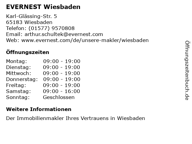 | Öffnungszeiten EVERNEST Wiesbaden in Wiesbaden anzeigen | |