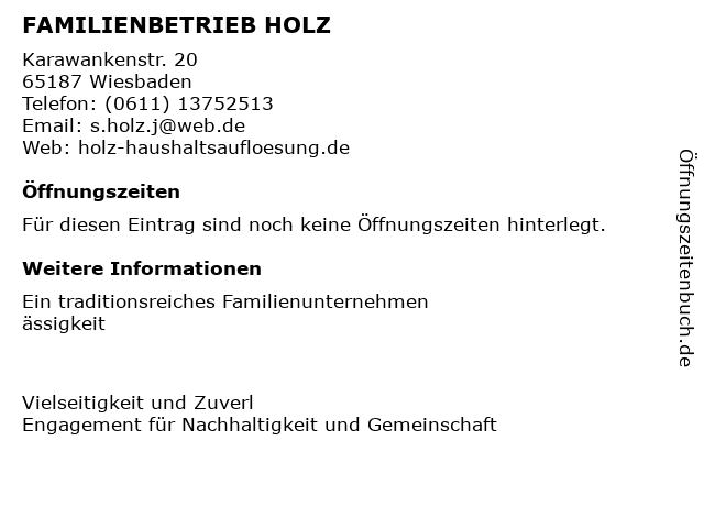 | Öffnungszeiten FAMILIENBETRIEB HOLZ in Wiesbaden anzeigen | |