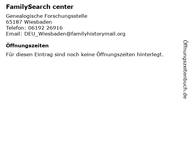| Öffnungszeiten FamilySearch center in Wiesbaden anzeigen | |
