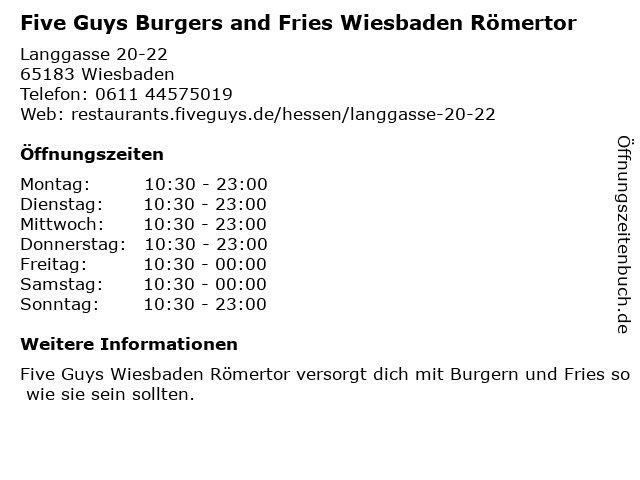 Branchen & Suchbegriffe zu Five Guys Burgers and Fries Wiesbaden Römertor:amerikanisches restaurant, and, burgers, fast food und take away, fast-food-restaurant, five, fries, guys, hot-dog-restaurant, restaurants, römertor |