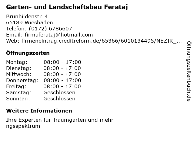 1 Garten und Landschaftsbau Wiesbaden - Galabau Hufnagel (Entfernung: 1,82 km) Schau-ins-Land 16, 65189 Wiesbaden 4 Erdbau - Landschaftsbau & Abbruch Cinar Bayram (Entfernung: 3,76 km) Spiekerooger Str. 16, 65199 Wiesbaden 5 Service in Grün Weber & Karst GbR Garten- und Landschaftsbau (Entfernung: 3,97 km) Saarstr. 114 A, 65201 Wiesbaden 6 |
