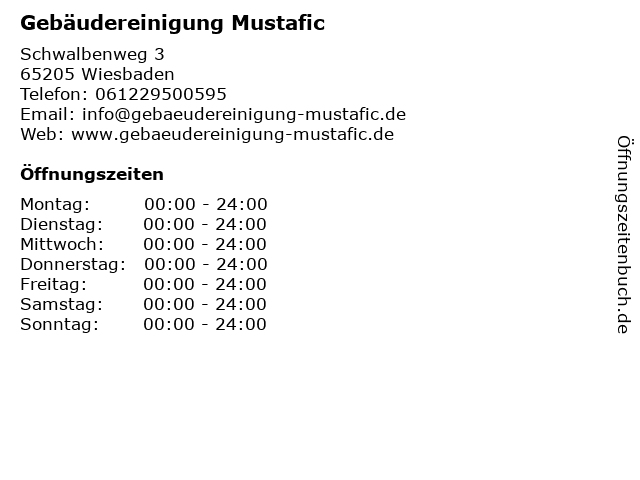 | Öffnungszeiten Gebäudereinigung Mustafic in Wiesbaden anzeigen | |