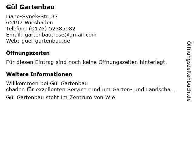 | Öffnungszeiten Gül Gartenbau in Wiesbaden anzeigen | |