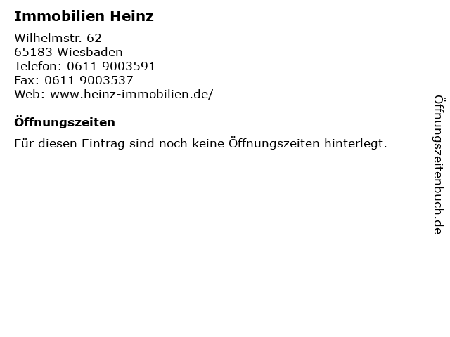 | Öffnungszeiten Immobilien Heinz in Wiesbaden anzeigen | |