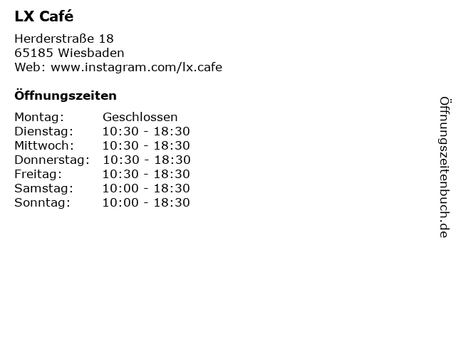 | Öffnungszeiten LX Café in Wiesbaden anzeigen | |