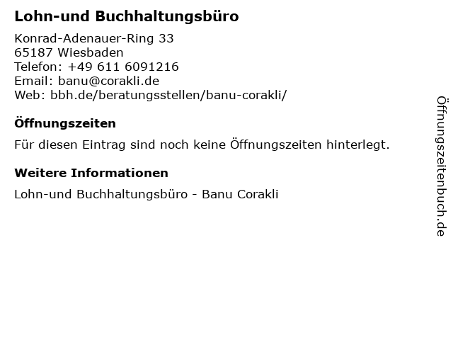| Öffnungszeiten Lohn-und Buchhaltungsbüro in Wiesbaden anzeigen | |