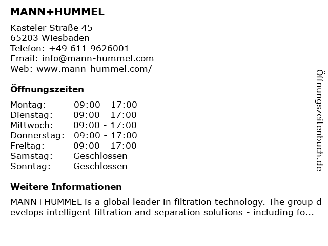 | Öffnungszeiten MANN+HUMMEL in Wiesbaden anzeigen | |